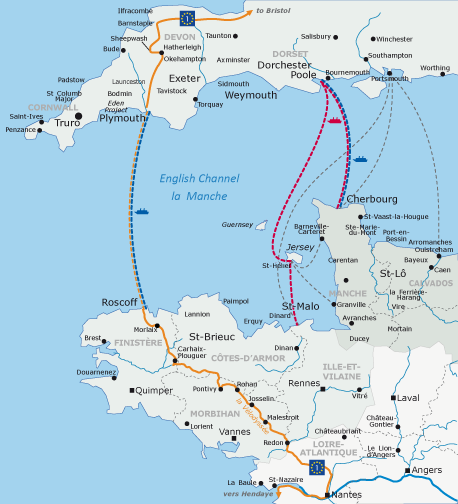Deux boucles franco-britaniques sont décrites en détail sur ce site: Tour de Manche (tracé bleu sur la carte) et Petit Tour de Manche (tracé rouge).